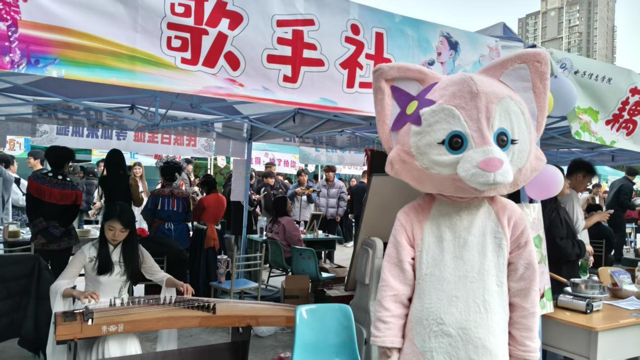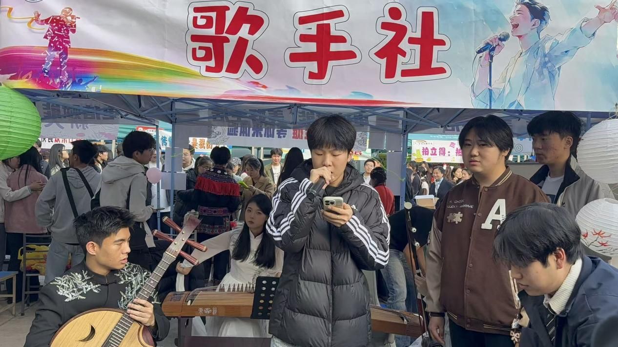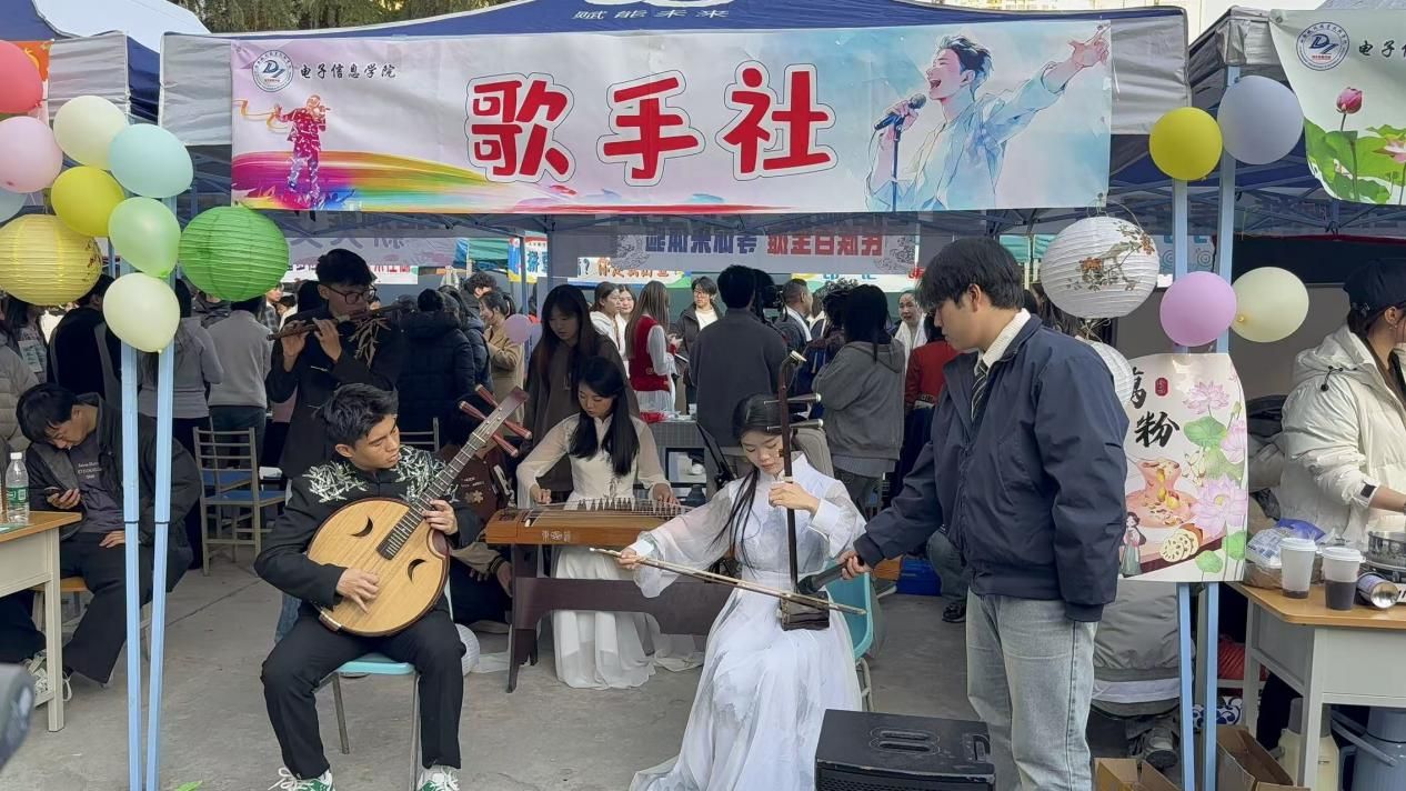歌手社摊位前,乐器合奏《青花瓷》的旋律一响起,便将集市的喧嚣轻轻沉淀。古筝开篇拨弦,二胡弓弦轻颤,竹笛穿插而入,吉他轻扫和弦,为古韵添了几分青春鲜活,让传统乐曲更具感染力。演奏者们默契配合,围观师生驻足静听,古典雅韵与校园活力完美交融,为集市注入别样的文化诗意。