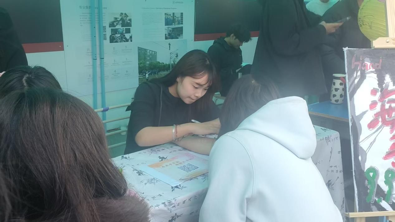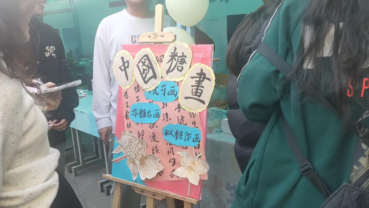 海娜与糖画摊位前围满驻足师生,指尖流转间尽是非遗魅力与创意巧思。画师手持融化的金黄糖浆,手腕轻扬间图案便在石板上成型,既是童年记忆里的味道,更是非遗技艺的鲜活展现;海娜手绘区,画师以植物染料为笔,在掌心、手腕绘出精致纹样,成为师生间互赠的别致纪念;簪花记韶华摊位前,精致步摇、素雅发簪整齐陈列,让传统簪花美学装点青春容颜;投壶摊位前更是热闹非凡,学子们手持箭矢瞄准壶口,让传统民俗游戏传递出别样欢乐。