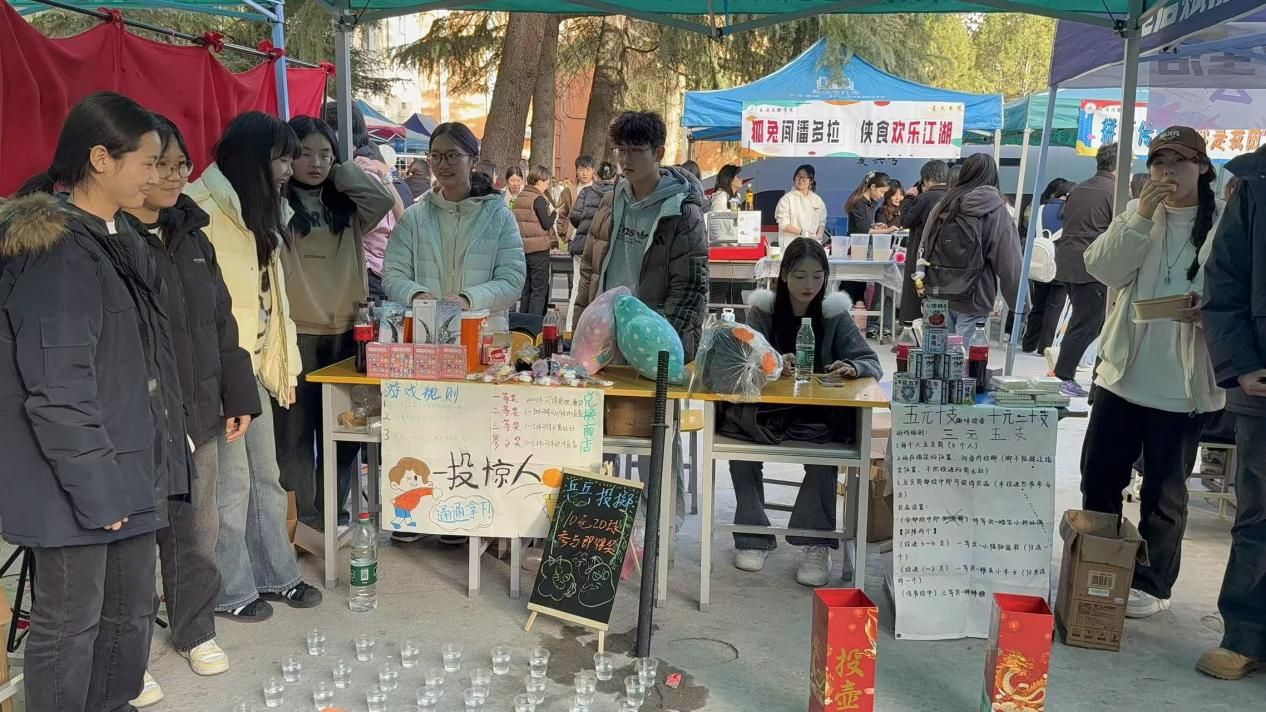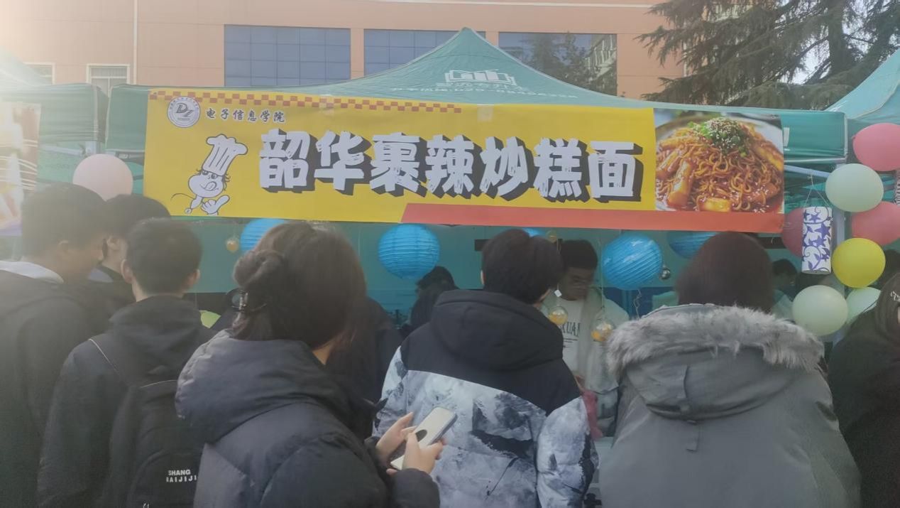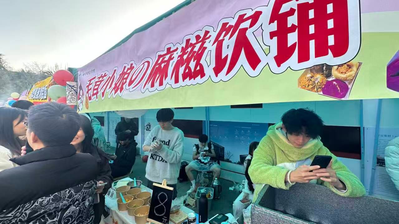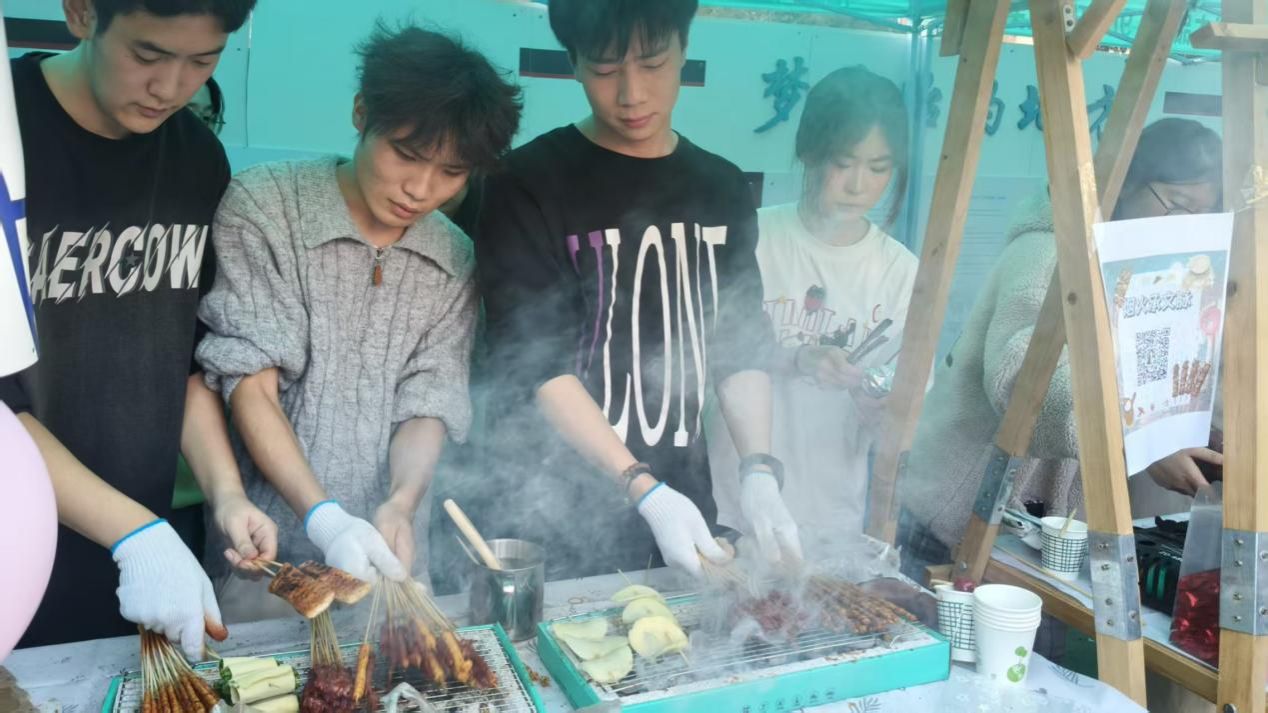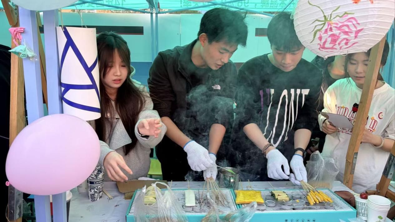 烤肉与烤奶摊位前早早排起长队,烟火气顺着蒸腾热气漫满广场。铁架上的鲜肉经炭火炙烤,每一口都是舌尖的满足;一旁的烤奶壶中,牛奶与红糖慢火熬煮,暖意在喉间蔓延;藕遇甜铺的鲜藕甜品清甜爽口,每一口都透着食材本真的鲜润;辣炒糕面摊位烟火升腾,软糯年糕混着劲道面条,鲜辣香气勾动食欲,成为冬日里的热辣滋味。这烟火缭绕的摊位藏着校园生活的热辣与温情,让师生在味蕾享受中感受烟火背后的文脉传承。