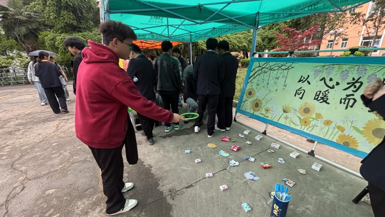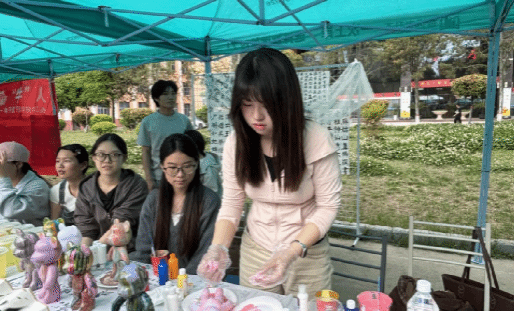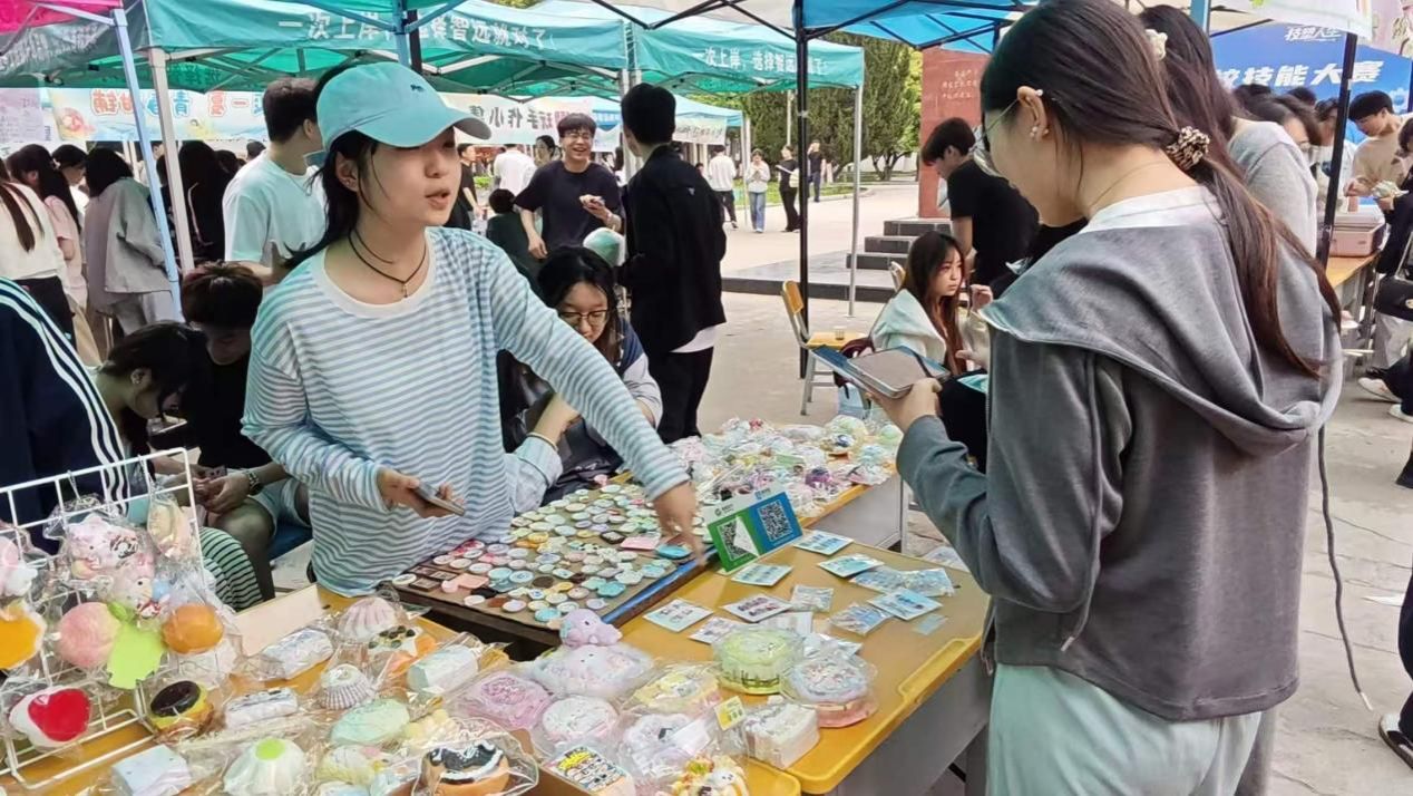 文创与趣味区同样精彩纷呈。手作文创区陈列着春夏主题书签、明信片,清新别致;可爱捏捏乐创意实用,吸引不少同学驻足挑选。现场还设有射击游戏与即兴演唱,趣味互动与悠扬歌声相映成趣,为文化集市增添了满满的欢乐与文艺气息,让同学们在逛玩选购中尽享春日美好时光。