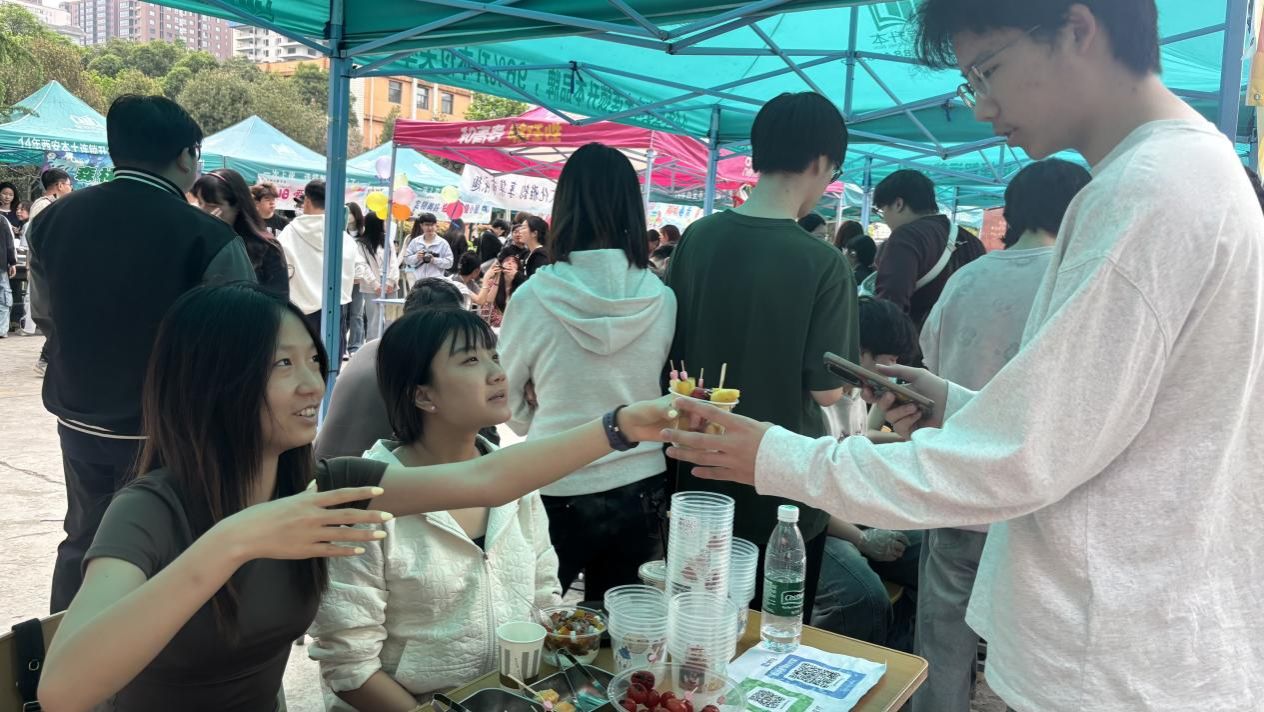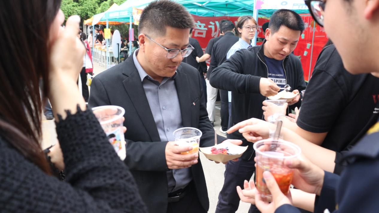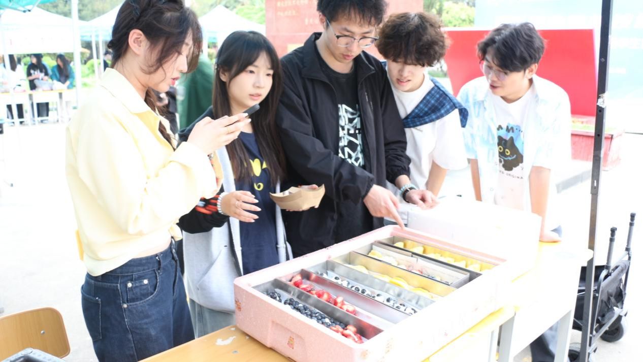 集市现场,各类摊位错落排布,烟火气十足。香气四溢的烤肉在烤盘上滋滋作响,肉质鲜嫩、焦香浓郁;清爽可口的水果捞汇聚多种新鲜果切,酸甜适口、颜值出众;冰粉晶莹爽滑,搭配红糖、坚果、果干等配料,入口清凉解腻;手工现制的柠檬茶、特色饮品茶香清新、酸甜开胃,同样备受同学们青睐。各个美食摊位前人头攒动,大家手持美食结伴品尝,欢声笑语萦绕全场。