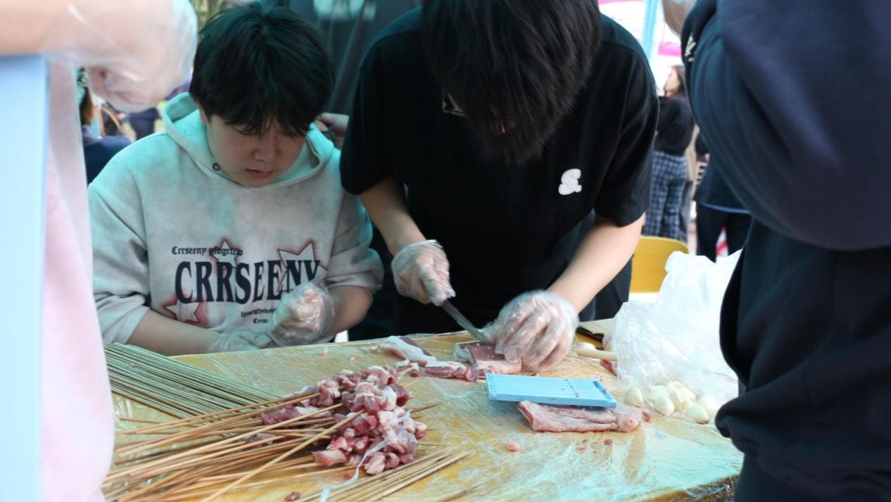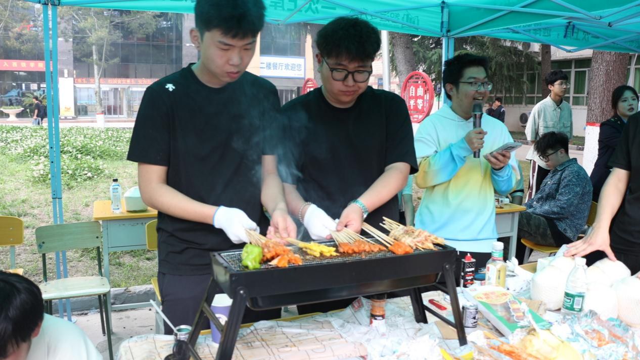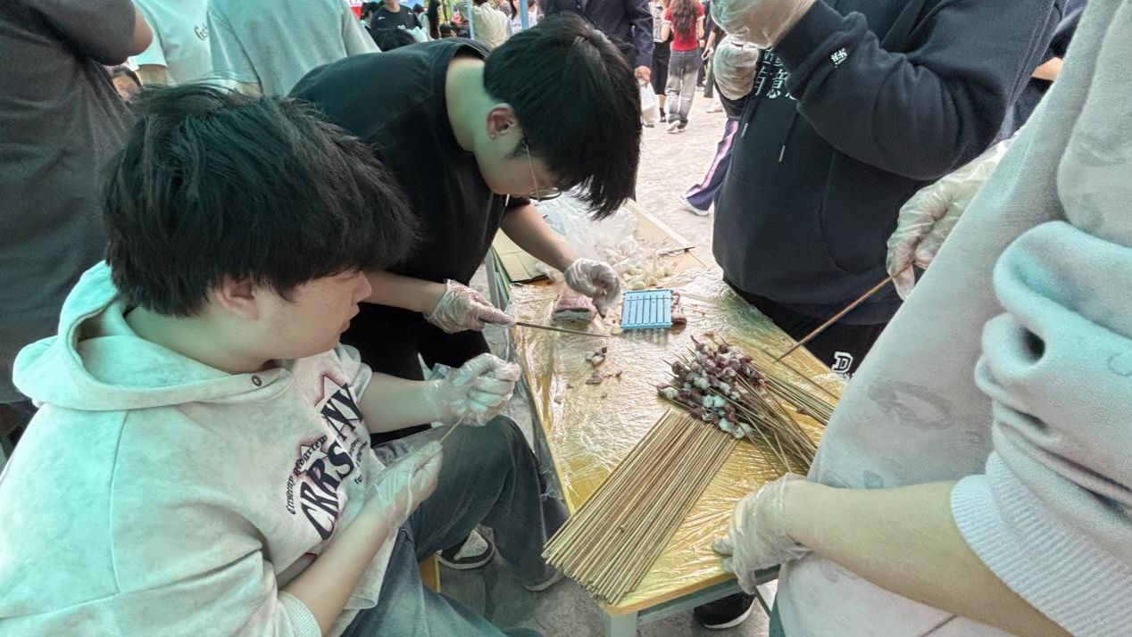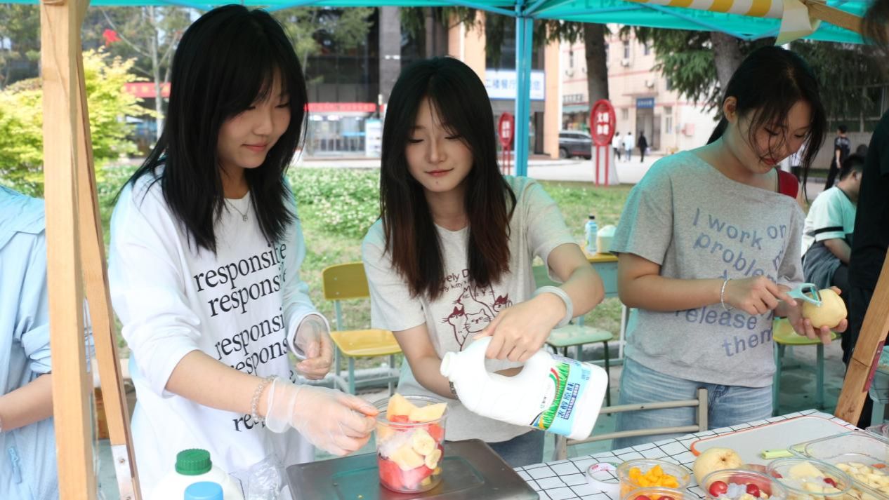集市现场,各类摊位错落排布,烟火气十足。香气四溢的烤肉在烤盘上滋滋作响,肉质鲜嫩、焦香浓郁;清爽可口的水果捞汇聚多种新鲜果切,酸甜适口、颜值出众;冰粉晶莹爽滑,搭配红糖、坚果、果干等配料,入口清凉解腻;手工现制的柠檬茶、特色饮品茶香清新、酸甜开胃,同样备受同学们青睐。各个美食摊位前人头攒动,大家手持美食结伴品尝,欢声笑语萦绕全场。