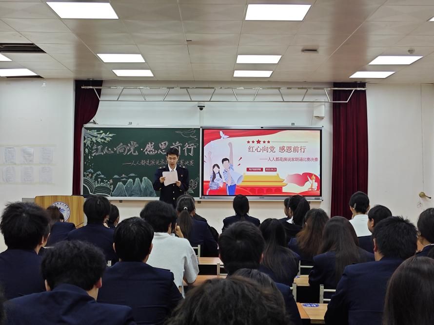 为弘扬红色文化,激发青年学子爱国情怀,9月23日晚,电子信息学院在教学楼407教室隆重举办“红心向党,感恩前行”人人都是演说家朗诵比赛决赛。活动自9月11日启动以来,历时15天,全院师生积极响应,累计吸引45名选手直接参与、800余名同学间接参与。经过初赛激烈角逐,15人晋级本次决赛。