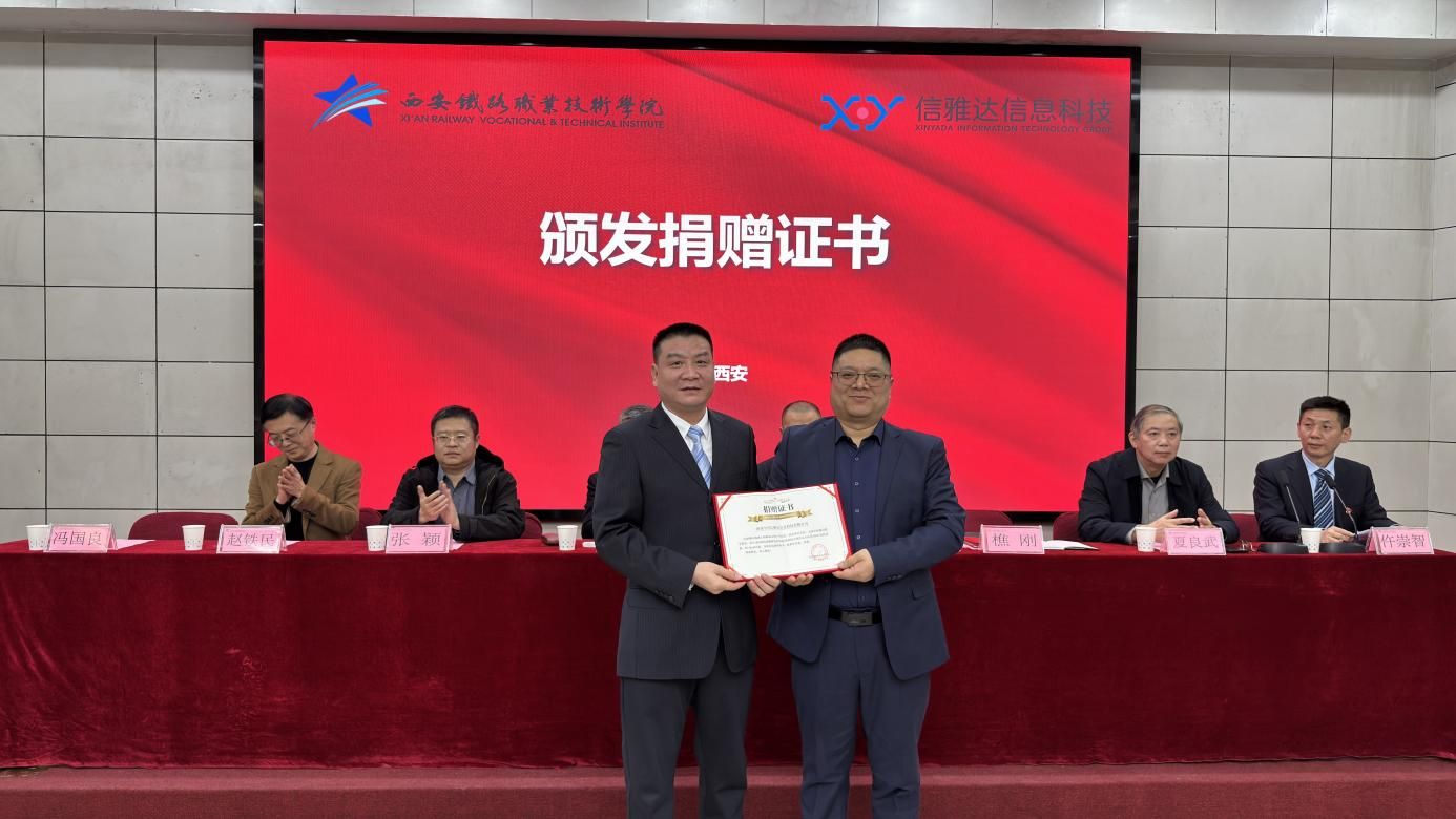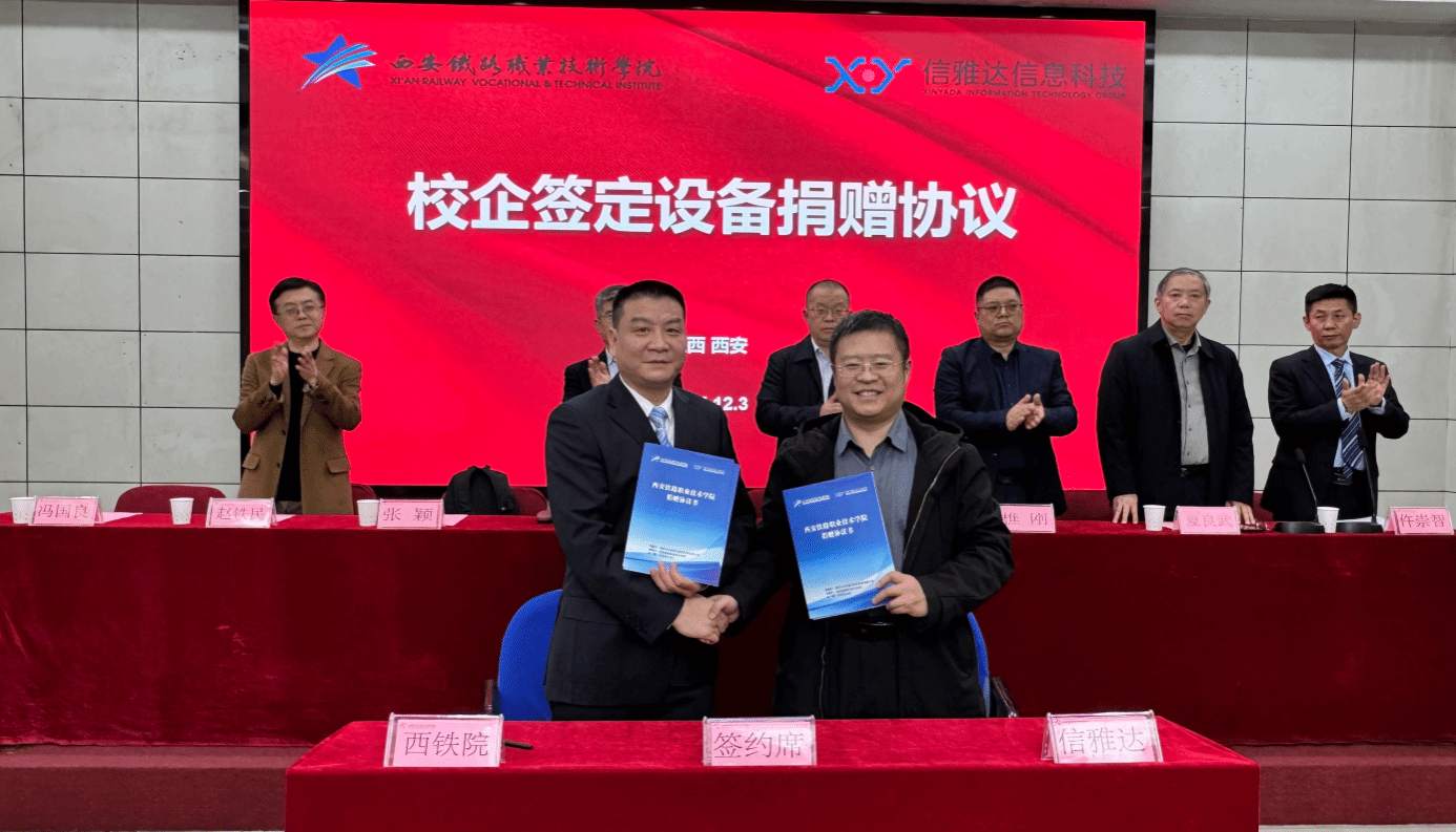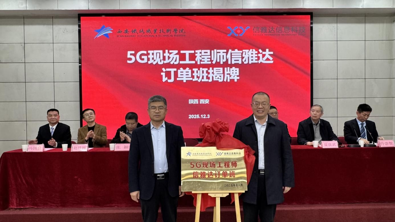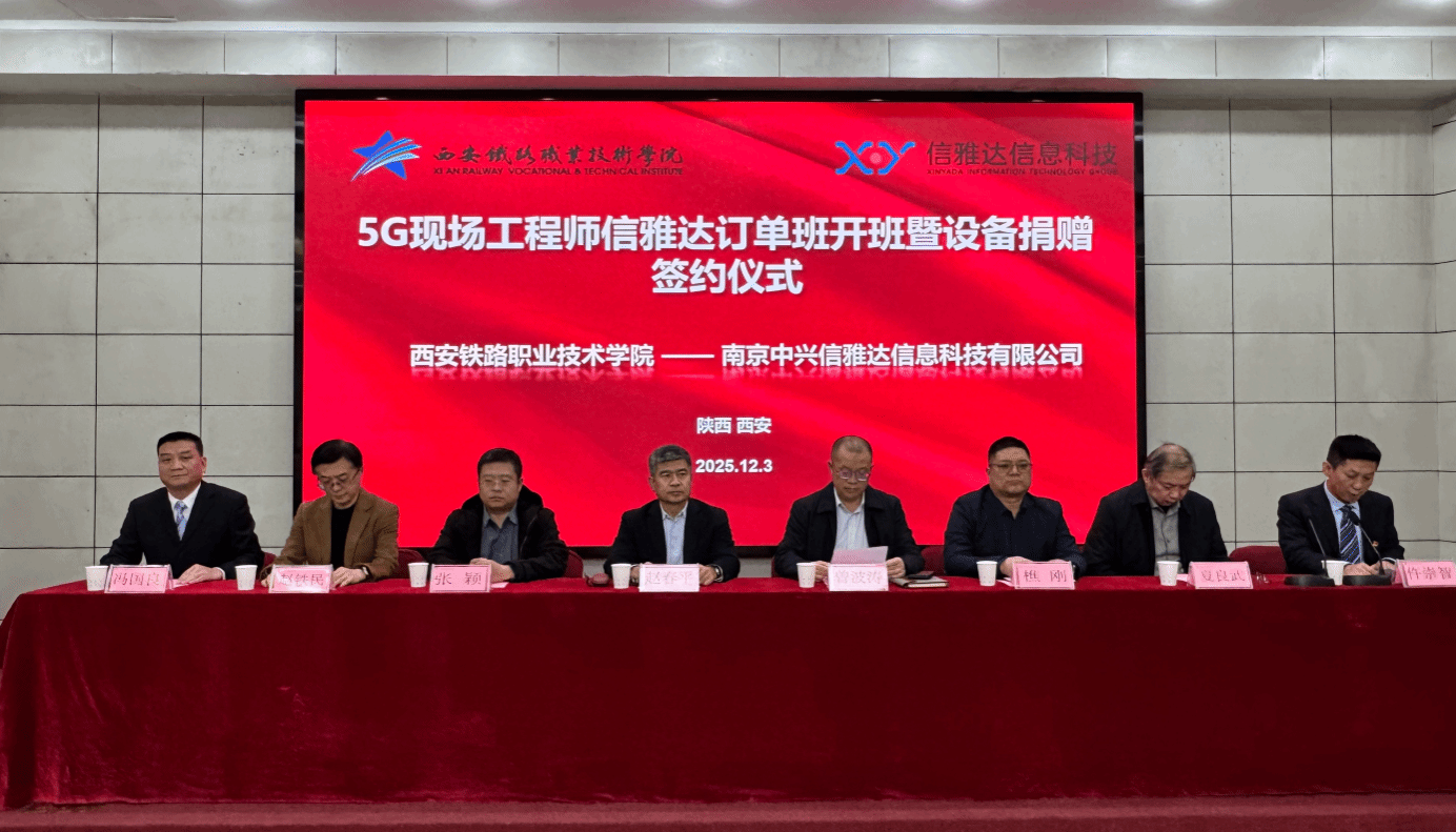 为深入贯彻国家职业教育改革精神,推动教育链、产业链、人才链、创新链深度融合,2025年12月3日,西安铁路职业技术学院与南京中兴信雅达信息科技有限公司隆重举行5G现场工程师信雅达订单班开班仪式。南京中兴信雅达信息科技有限公司总裁曾波涛、高级副总裁张颖、陕西区域总监樵刚,西安铁路职业技术学院党委书记赵春平、人事处处长赵铁民、招生办公室主任夏良武、电子信息学院党总支书记仵崇智、院长冯国良及学院相关领导、教师代表与订单班学生共同见证这一重要时刻,仪式由仵崇智主持。