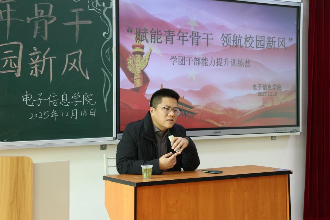 为深入贯彻落实立德树人根本任务,进一步加强学生骨干队伍建设,提升学团干部的思想政治素质、综合能力与责任担当意识,12月18日,电子信息学院在教学楼407会议室成功举办“赋能青年骨干,领航校园新风”第二期学团干部能力提升训练营。本次活动由学工办胡士亮老师主讲,旨在引导广大学生骨干坚定理想信念、强化服务意识、提升履职能力,在校园学习与生活中发挥模范带头作用,助力学院学风建设与管理工作提质增效。