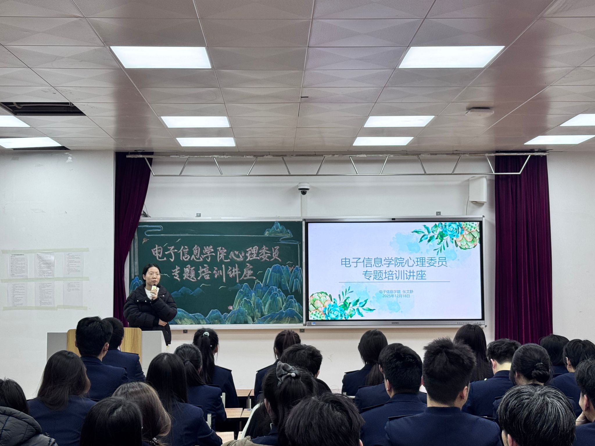 为进一步加强大学生心理健康教育工作,提升班级心理委员的专业素养与履职能力,筑牢校园心理健康防护网。2025 年 12 月 18 日,电子信息学院(立心书院)于教学楼 407 教室成功举办心理委员专题培训讲座。由张文静老师主讲,各班心理委员参与培训。