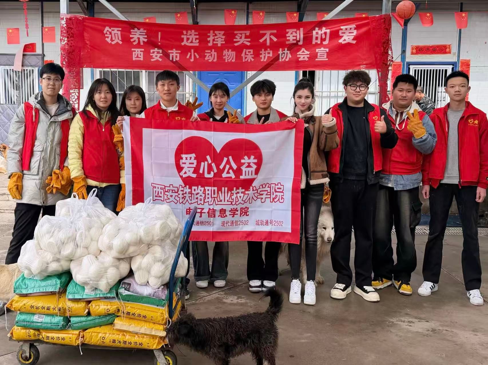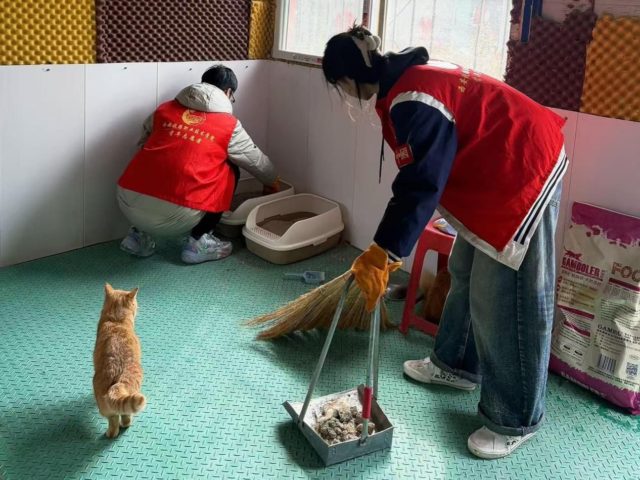校园外,温暖善意持续传递。在老师的带领下,同学们前往西安市流浪动物救助中心,开展爱心公益活动。大家为流浪小动物送去20袋猫粮狗粮及500个馒头,并主动打扫犬舍、猫舍,用细心与温柔守护每一个小生命,让关爱与温暖在志愿服务中传递。