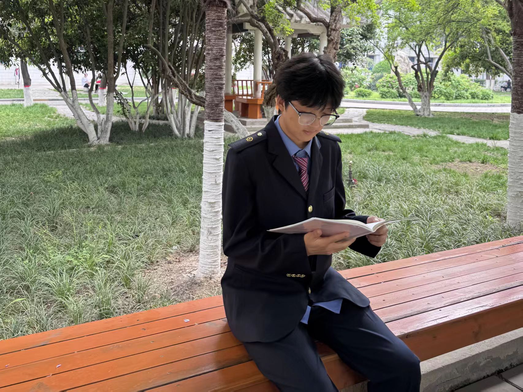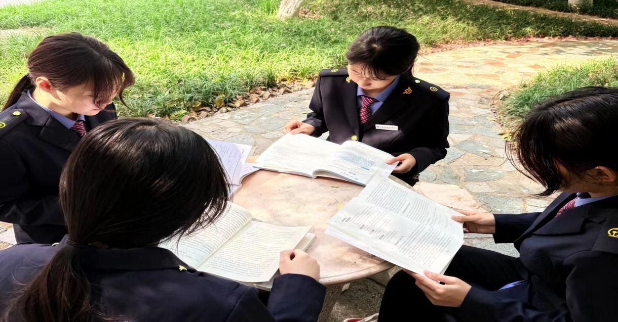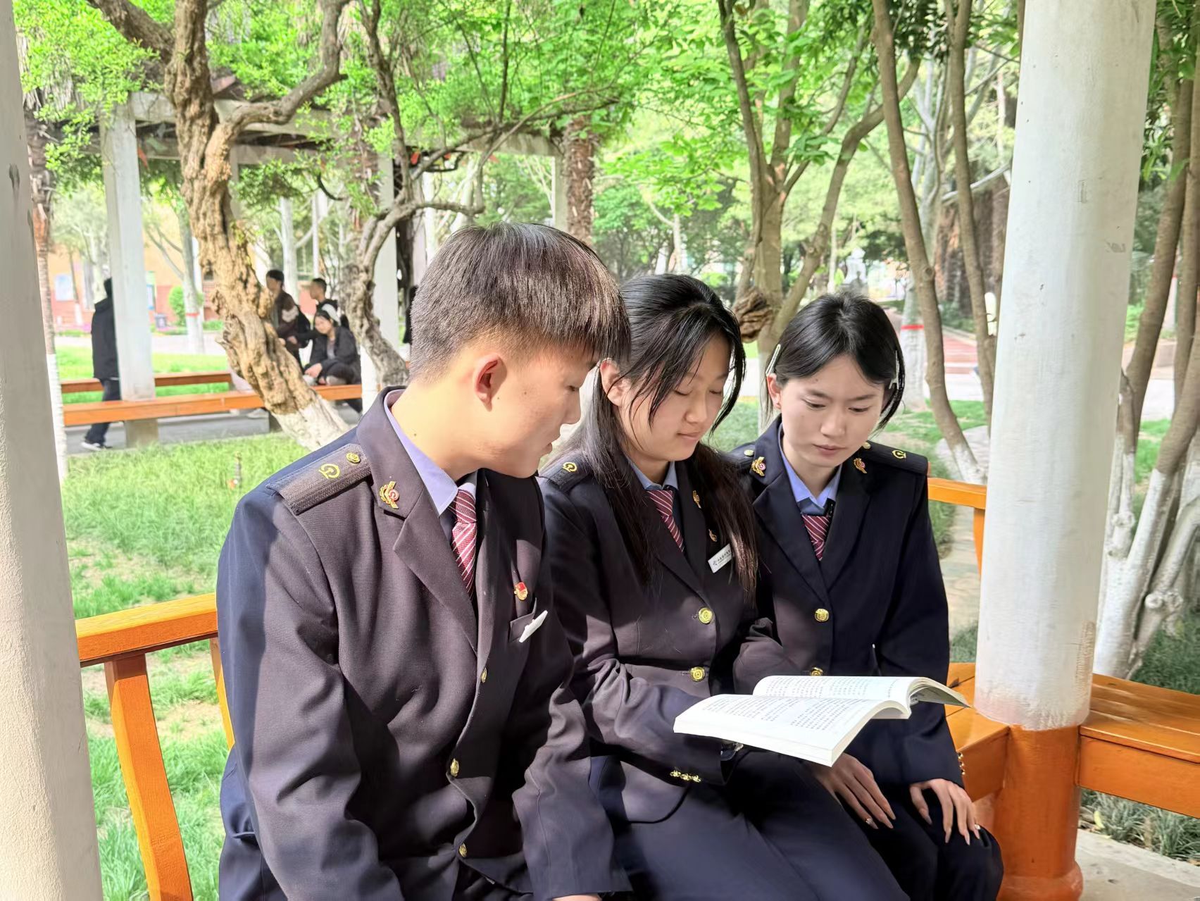 现代通信2502团支部的团员身着制服在樱花校园里共读红色经典与专业书籍、交流学习心得,在书香与春光中坚定理想信念、凝聚青春力量。